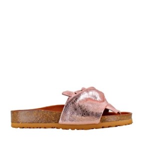 Sandalia plana con acabado metalizado en tono rosa, diseño cruzado con lazo decorativo y suela de corcho natural. Una opción elegante y cómoda para complementar tus estilismos estivales con un toque distintivo.